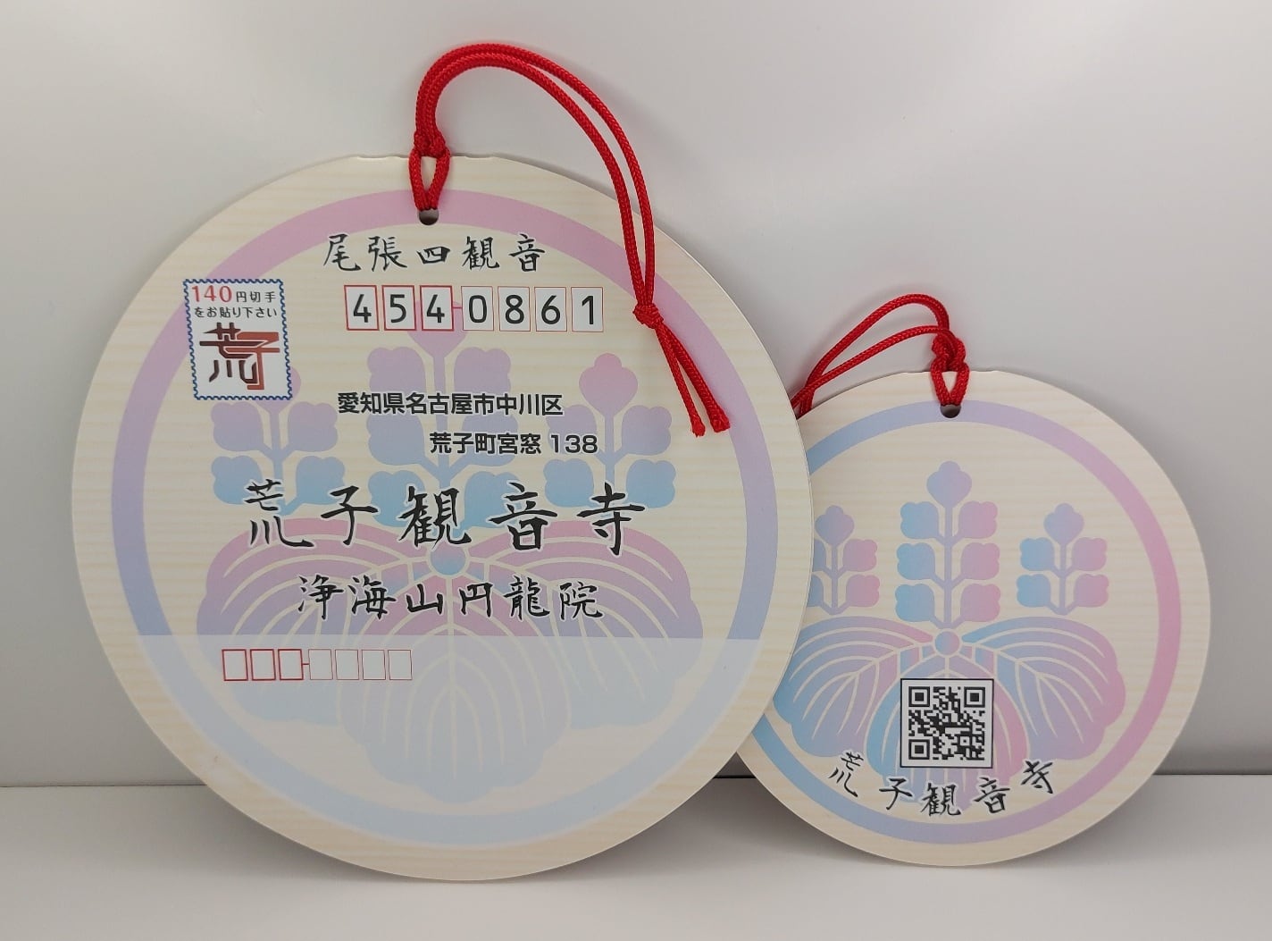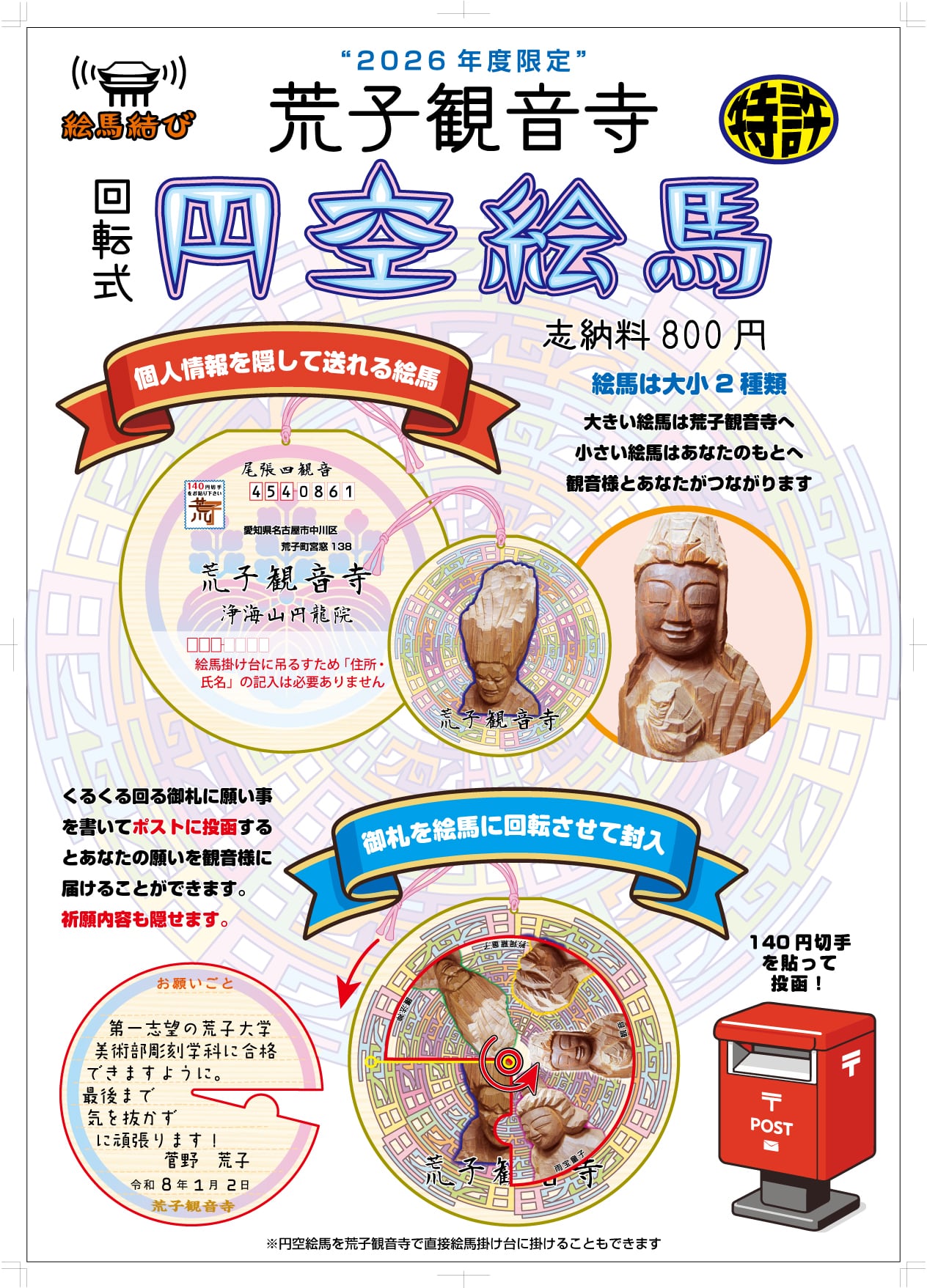 この絵馬は紙製で、円形の封筒の形になっており、願い事を記入した円形の御札を回転させながら封入します。この絵馬を奉納する場合は、140円切手を貼って定形外郵便で荒子観音寺に郵送でき、差出人の住所や氏名を記入することなく願いを届けることができます。